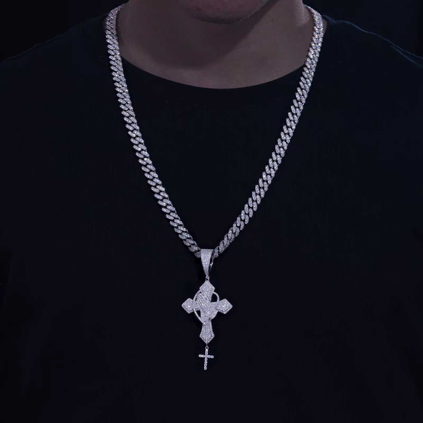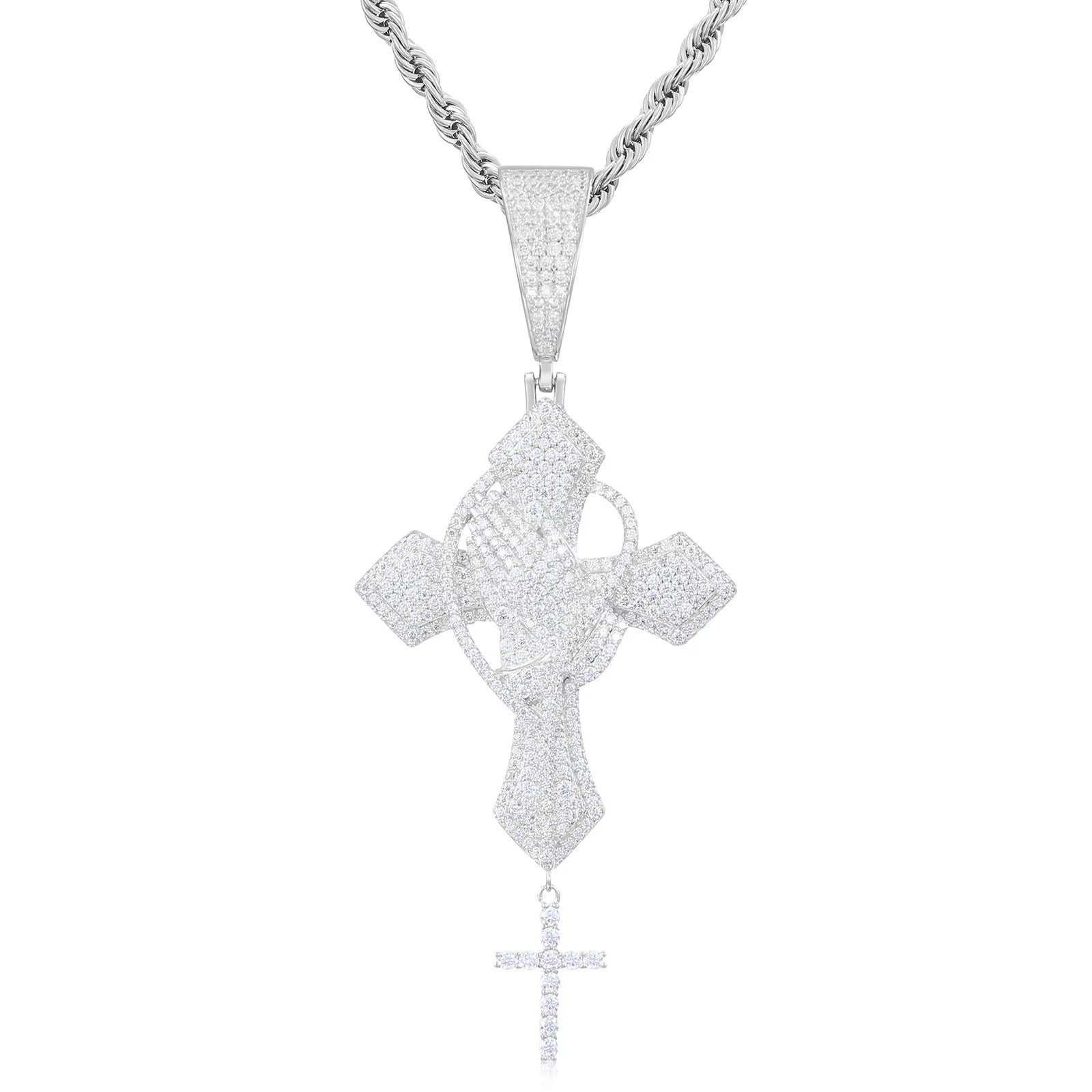 Silver Lab grown vvs moissanite praying Jesus hand with cross pendent.
